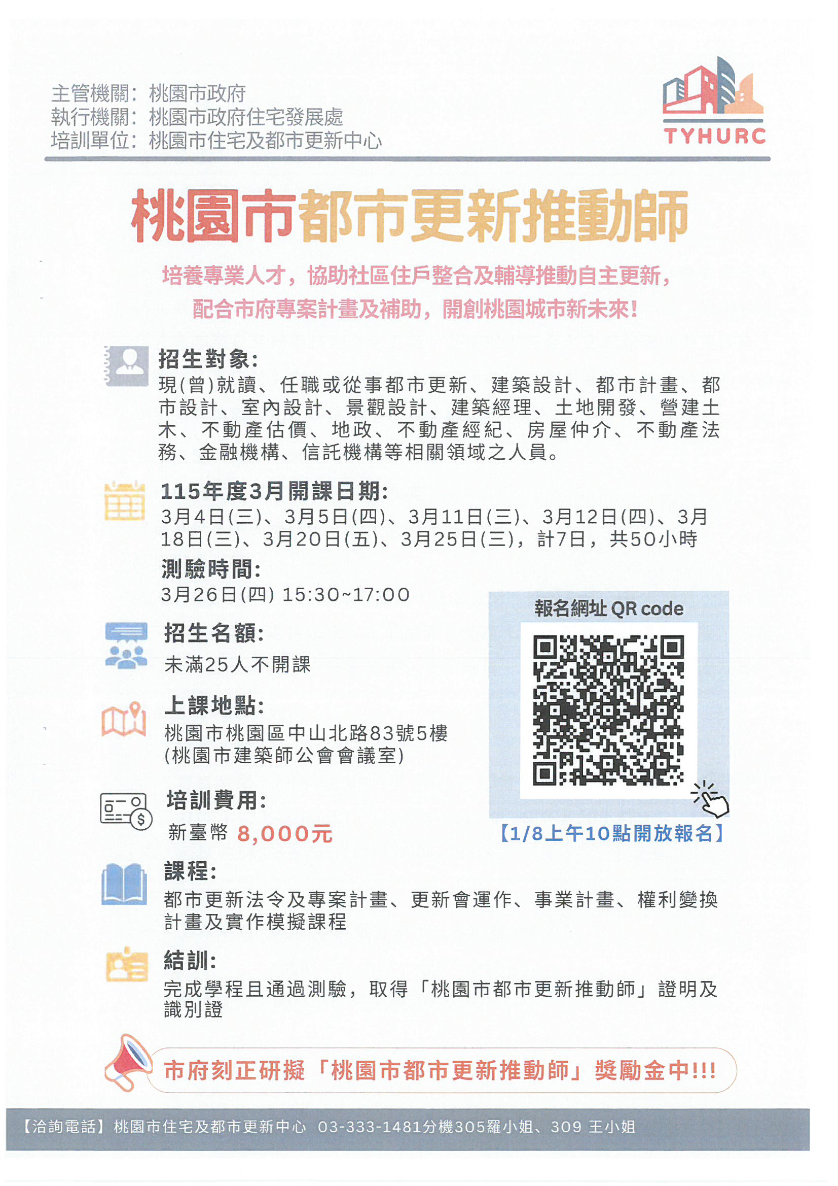 2026-02-26 【轉發公告 | 培訓課程】桃園市都市更新推動師培訓課程 📌【桃園市都市更新推動師培訓課程|專業養成班】 想成為 都市更新推動師,協助社區更新與都市再生?這堂專業培訓 不能錯過! ✨ 📌 課程重點 ✔ 系統化學習都市更新法令、容積獎勵、更新會運作等實務內容 ✔ 包含實作模擬與結訓測驗 ✔ 完成學習並通過測驗可取得 推動師證明與識別證 📅 上課日期與時數 – 約 6–7 天密集授課(約 50 小時) (實際時間請點進課程頁面查詢) 💰 參訓費用 ✔ 新台幣 8,000 元(一次性) 👥 適合對象 – 對都市更新有興趣的專業人士 – 不動產、建築、地政、法務等相關領域者 – 想進一步提升都市更新實務能力的你! 📍 主辦單位 桃園市住宅及都市更新中心 👇 立即查看課程詳情與報名 ➡️ https://www.tyhurc.org.tw/TaoyuanColiving/Portal/TrainingCourse/TrainingInfo?HID=8a98a234-fbba-472d-8b3c-61cc23b42ca2 回上一頁
