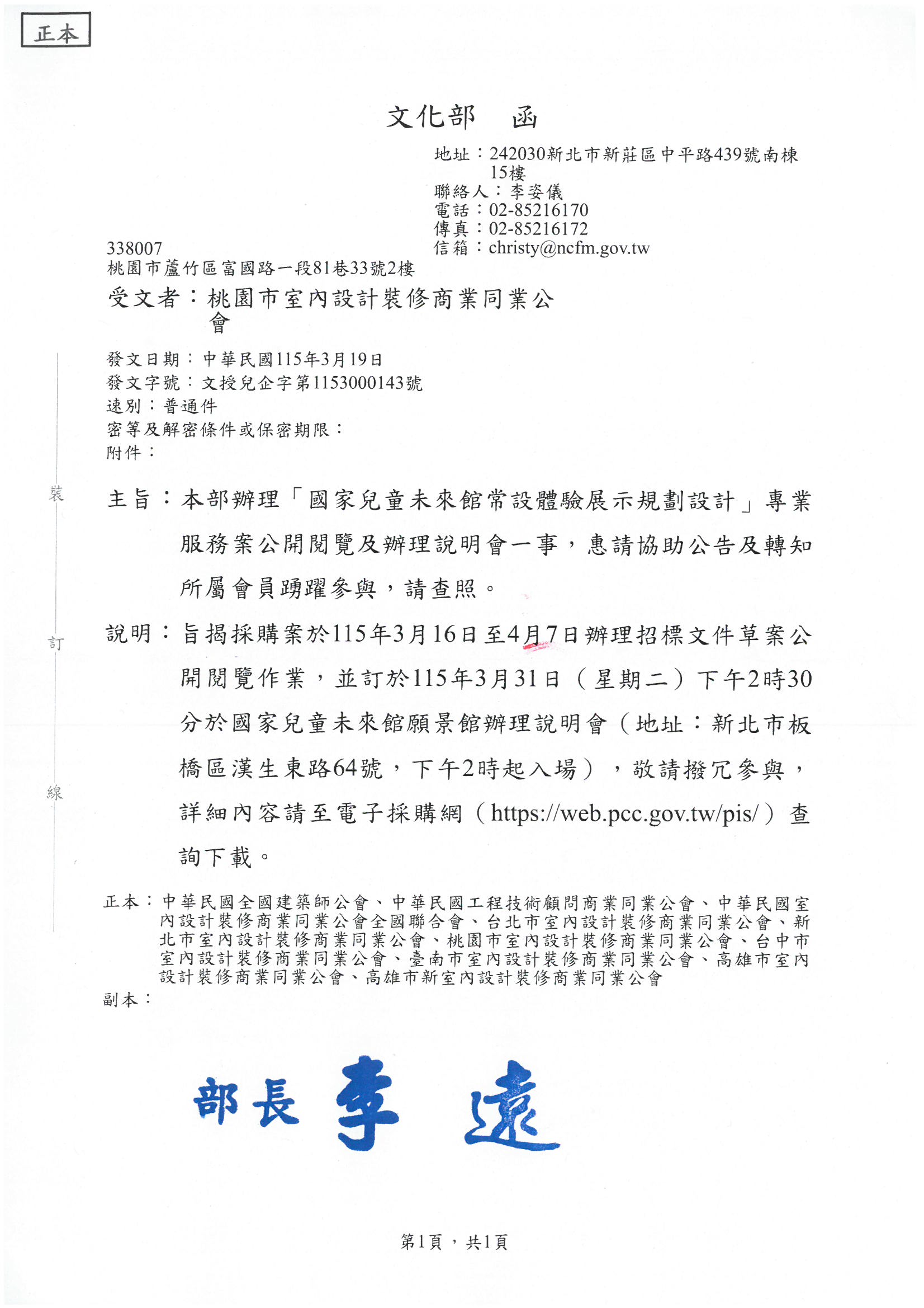2026-03-30 【轉發公告 | 公開招標】國家兒童未來館常設體驗展示規劃設計 【轉發公告 | 公開招標】 文化部辦理「國家兒童未來館常設體驗展示規劃設計」專業服務案,歡迎會員參考及踴躍參與。 📄 招標文件公開閱覽 🗓 115/3/16-4/7 🔎 https://web.pcc.gov.tw/pis/ 📍 招標說明會 🗓 115/3/31(二)14:30(14:00入場) 📌 國家兒童未來館願景館 (新北市板橋區漢生東路64號) 回上一頁