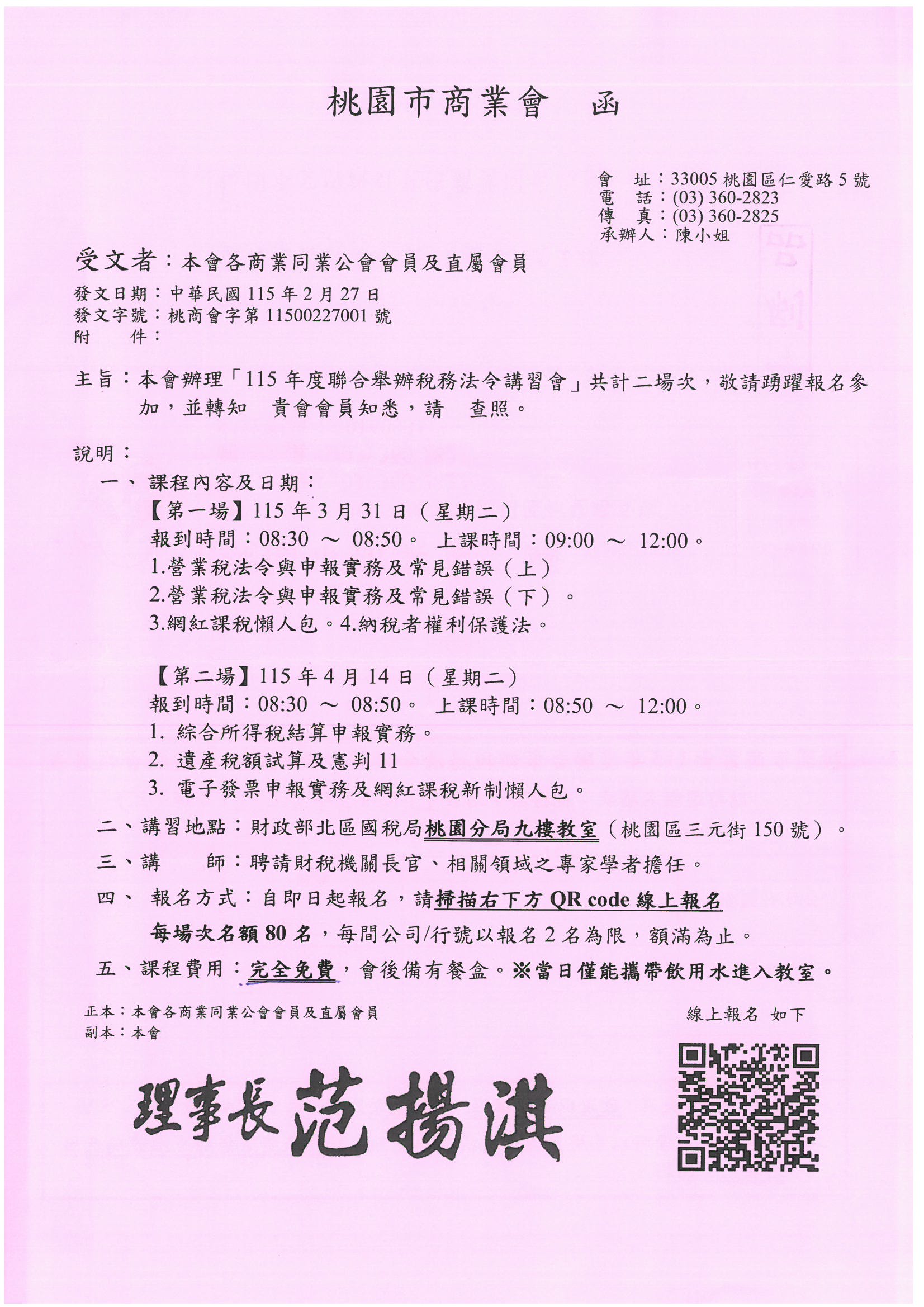2026-03-13 【轉發公告 | 免費講座】115年度聯合舉辦稅務法令講習會 一、 課程內容及日期: 【第一場】115年3月31日(星期二) 報到時間:08:30 ~ 08:50。 上課時間:09:00 ~ 12:00。 1.營業稅法令與申報實務及常見錯誤(上) 2.營業稅法令與申報實務及常見錯誤(下)。 3.網紅課稅懶人包。4.納稅者權利保護法。 【第二場】115年4月14日(星期二) 報到時間:08:30 ~ 08:50。上課時間:08:50 ~ 12:00。 1. 綜合所得稅結算申報實務。 2. 遺產稅額試算及憲判11 3. 電子發票申報實務及網紅課稅新制懶人包。 二、講習地點:財政部北區國稅局桃園分局九樓教室(桃園區三元街150號) 三、講 師:聘請財稅機關長官、相關領域之專家學者擔任。 四、報名方式:自即日起報名,請用QR-CODE線上報名。每場次名額80名,以報名2名為限,額滿為止。 線上報名 : https://docs.google.com/forms/d/1wwZ2fkI2iNgIIz4_HSZ46Iaom5Ki-kDtuVA47NjjfoY/viewform?edit_requested=true 回上一頁