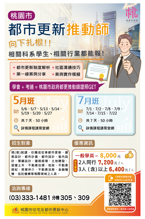 2026-04-10 【轉發公告 | 培訓課程】桃園市都市更新推動師培訓課程 桃園市政府推出「都市更新推動師培訓課程」! 培養地主溝通、案件整合與實務推動能力,成為社區與專業團隊的橋梁。 ✨ 參與好處: ♦︎搶先切入都市更新初期,掌握案件機會 ♦︎拓展服務層級,從裝修延伸至前端規劃顧問 ♦︎都更完成後,帶來大量室內設計與裝修需求 誠摯邀請有志業者踴躍參加,一起掌握都市更新趨勢與商機! 👉 報名從速 : https://reurl.cc/183xbm 回上一頁