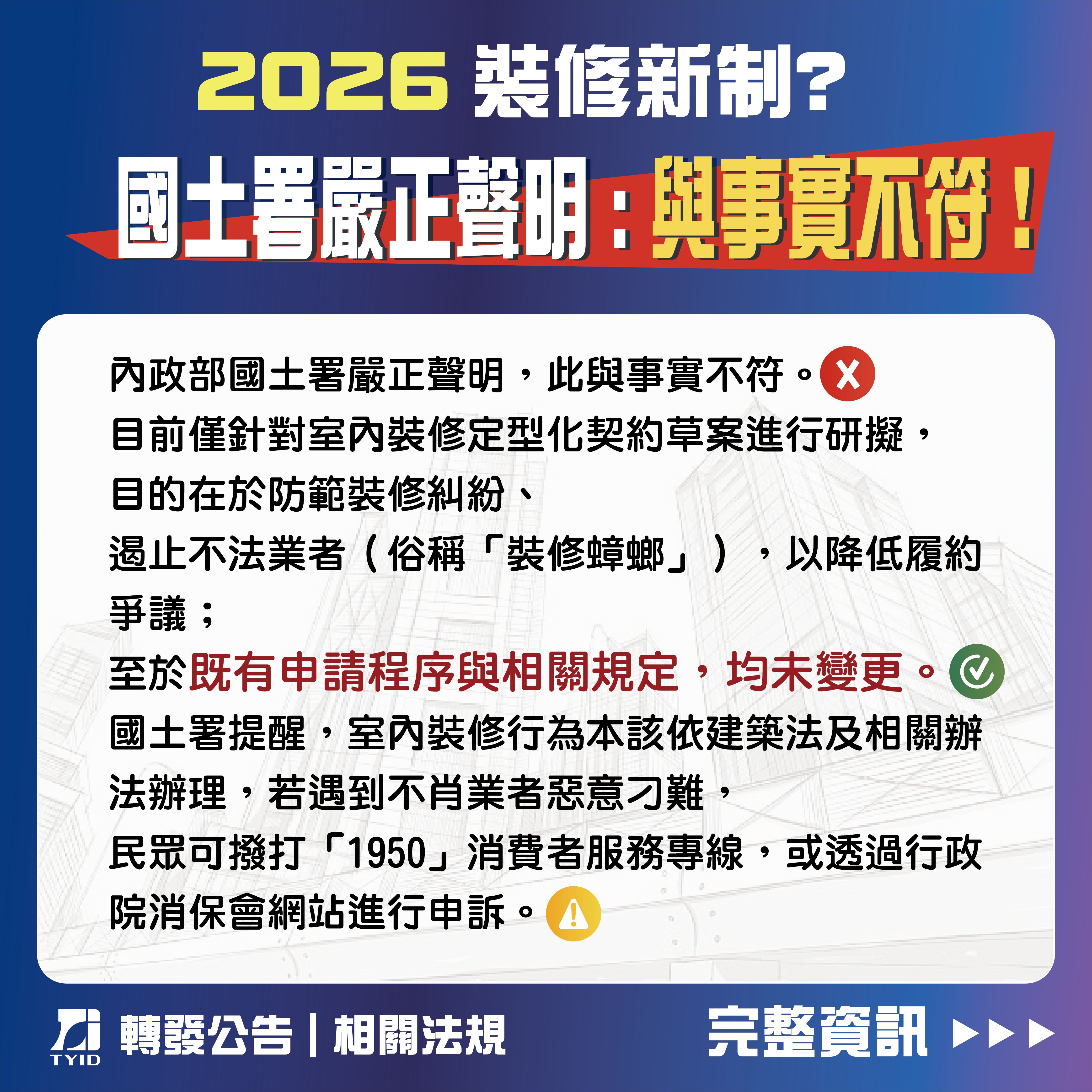 2026-04-17 【轉發公告 | 相關法規】假訊息流傳 內政部國土署嚴正聲明與事實不符 轉發公告 | 相關法規 「2026裝修新制將上路 先申請審查才開工」假訊息流傳 內政部國土署嚴正聲明與事實不符 完整資訊內容 : https://www.moi.gov.tw/News_Content.aspx?n=4&s=337863 回上一頁
